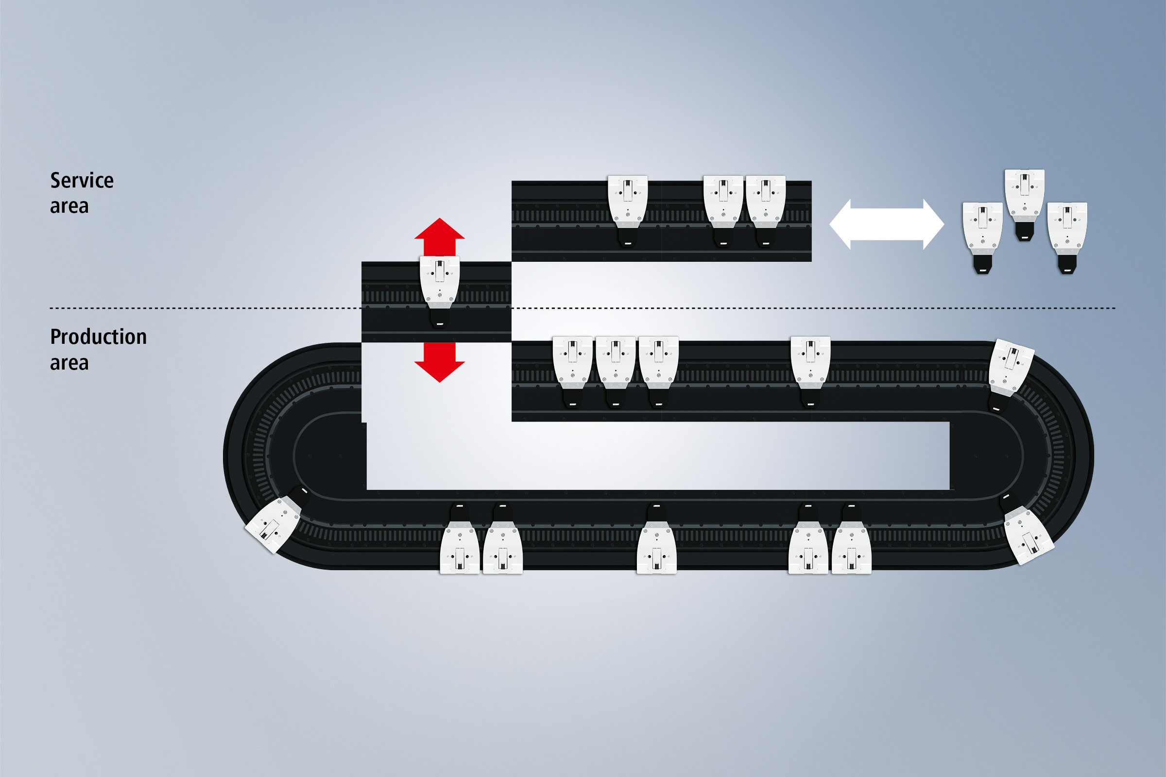 Additional variety is provided by combining Leave and Arrive with Track Management, which allows a unique route with individual destinations to be defined for each mover. The route passes over partial sections of one or more XTS systems. Exchanging movers between different XTS sections takes place via mechanically moved partial sections. This allows maintenance areas to be defined separately from the regular production process. Inspection, cleaning or exchanging movers takes place in these areas.