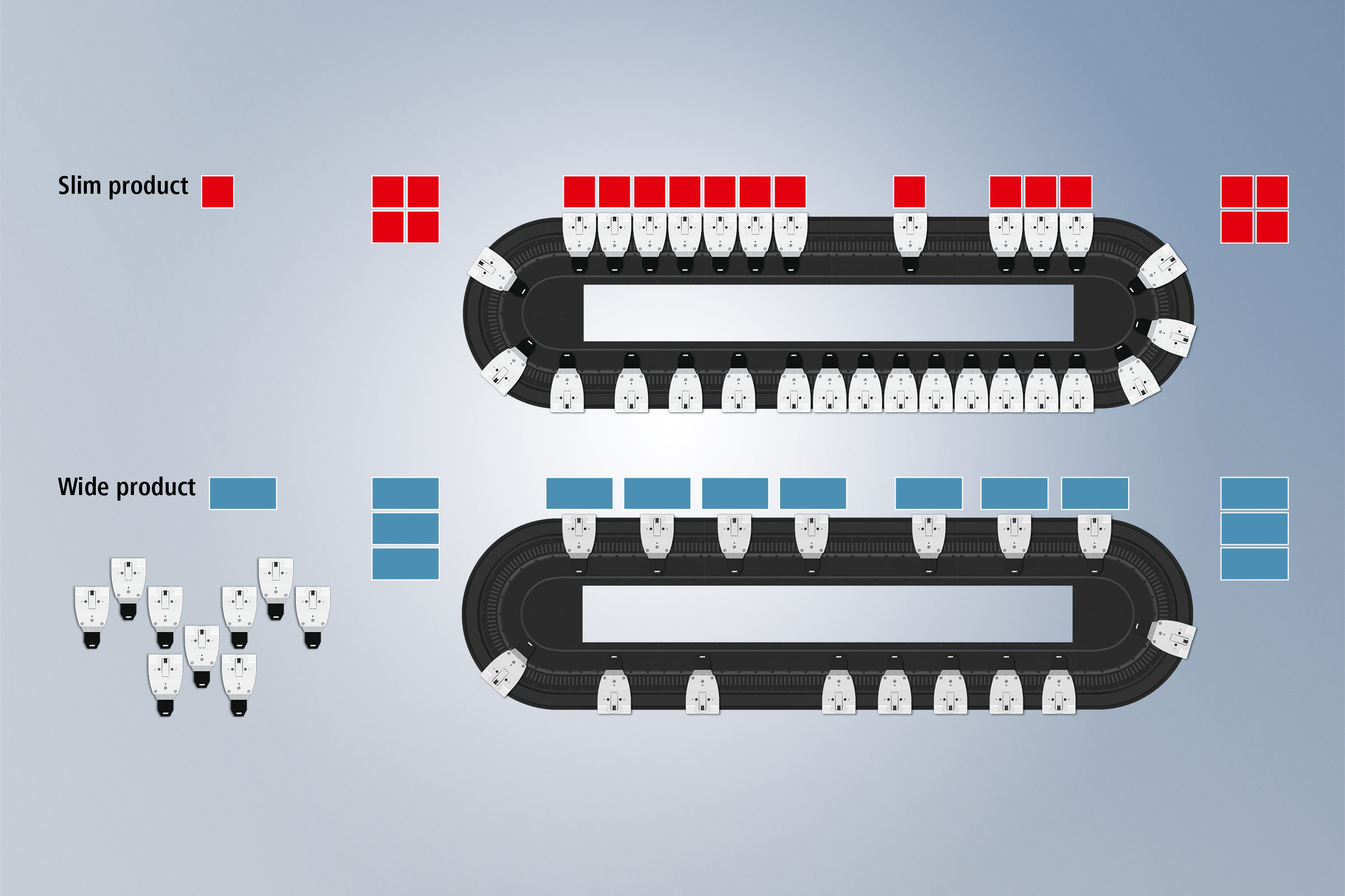 The combination of the XTS with conventional conveying technology is now also possible, but only if a continuous mechanical guide is available and a production output of 60 ppm is not exceeded. The dynamic departure and arrival of the movers on the XTS motor modules results in a demand-driven application with partially intelligent route sections.