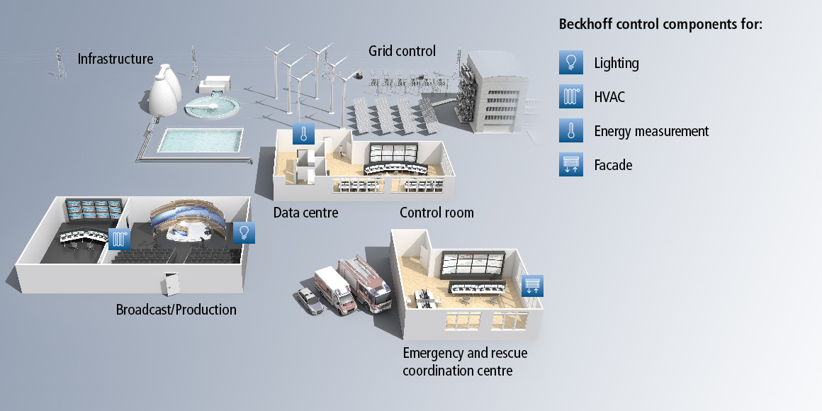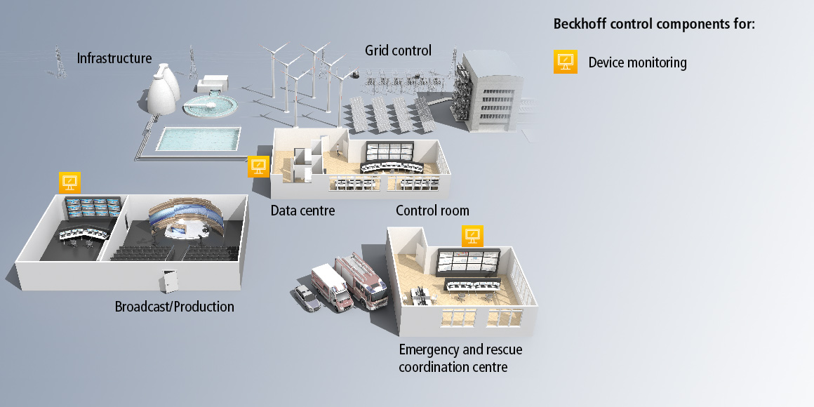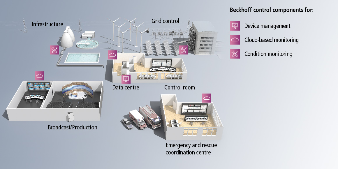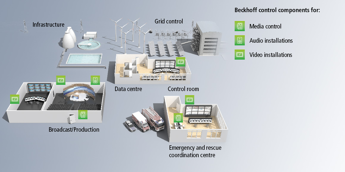 Whenever fail-safe monitoring is a critical requirement, be it in emergency or rescue centers, data centers, infrastructure and grid control centers or in TV and broadcast production, reliable and robust control technology is a must. With the industry-proven PC-based automation solution from Beckhoff, all different infrastructure systems from audio and video control, and building automation to digital signage or operating and monitoring systems can be seamlessly integrated on a central platform.
